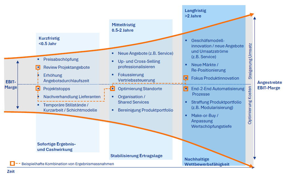 Die Hebel, um in exportorientierten Unternehmen die Abhängigkeit von Handelshemmnissen und dem starken Schweizer Franken zu reduzieren, sind bewährt. Es gilt, die richtige Kombination an Instrumenten und Massnahmen zu finden, um die Wettbewerbsposition und Ertragskraft langfristig zu sichern. Kurz-, mittel- und langfristige Massnahmen sind punkto Investitionen, internen und externen Ressourceneinsatz und gegenseitige Abhängigkeiten abzustimmen und in einem Transformationsprogramm zu kombinieren. Kurzfristig ist die zeitnahe Ergebnis- und Cashwirkung entscheidend, während mittel- und langfristig die Ertragslage und nachhaltige Wettbewerbsfähigkeit gestärkt wird.