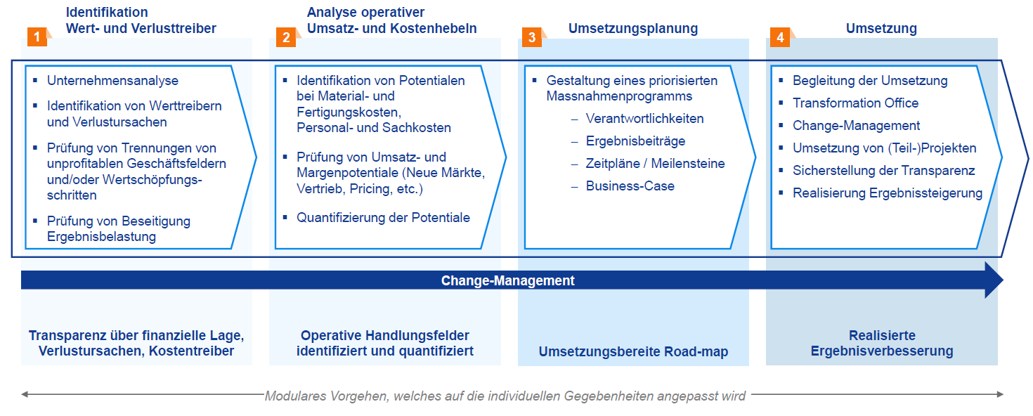Das umfassende, in sich abgestimmte Turnaround-Programm ermöglicht Investitionen in aussichtsreiche Wachstumsfelder durch die konsequente Einsparung von Herstellkosten und ist damit ein gutes Beispiel für eine abgestimmte, breit abgestützte Transformation, in der einzelne Hebel ineinandergreifen.