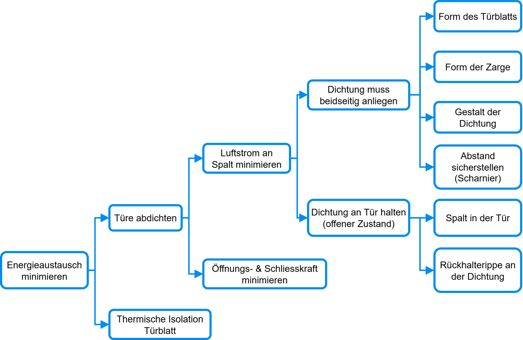Im Beispiel des Kühlschranks wird dazu in der Regel eine umlaufende Gummidichtung gewählt, um die Funktion „Luftstrom am Spalt minimieren“ zu erreichen. Daraus lassen sich klare und messbare Anforderungen an die betroffenen Komponenten Türblatt, Zarge, Scharnier/Schloss und Dichtung ableiten.