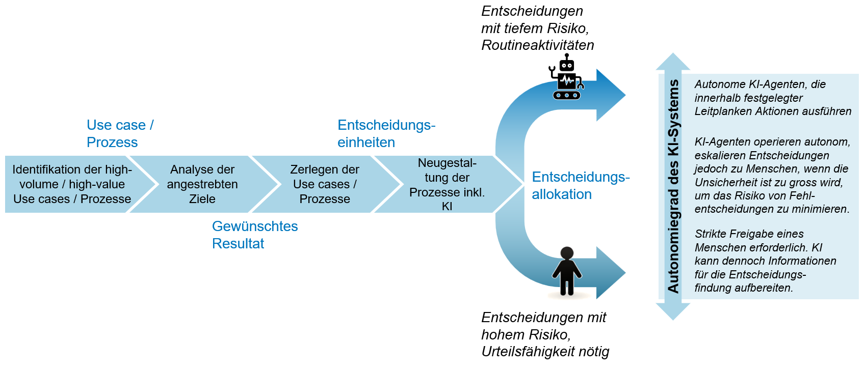 Entscheidend ist zudem die richtige Verteilung von Entscheidungen zwischen Mensch und System. Je nach Risikoprofil und weiteren Rahmenbedingungen kann der Autonomiegrad eines KI-Systems stark variieren. Unabhängig davon verbleibt die Verantwortung bei den Fachleuten. Diese müssen Leitplanken festlegen und laufend überwachen, Risikoschwellen definieren, Qualitätskontrollen, Bias-Prüfungen oder klare Eskalationskriterien definieren. Bei erhöhtem Risiko wird menschliches Eingreifen gezielt ausgelöst.