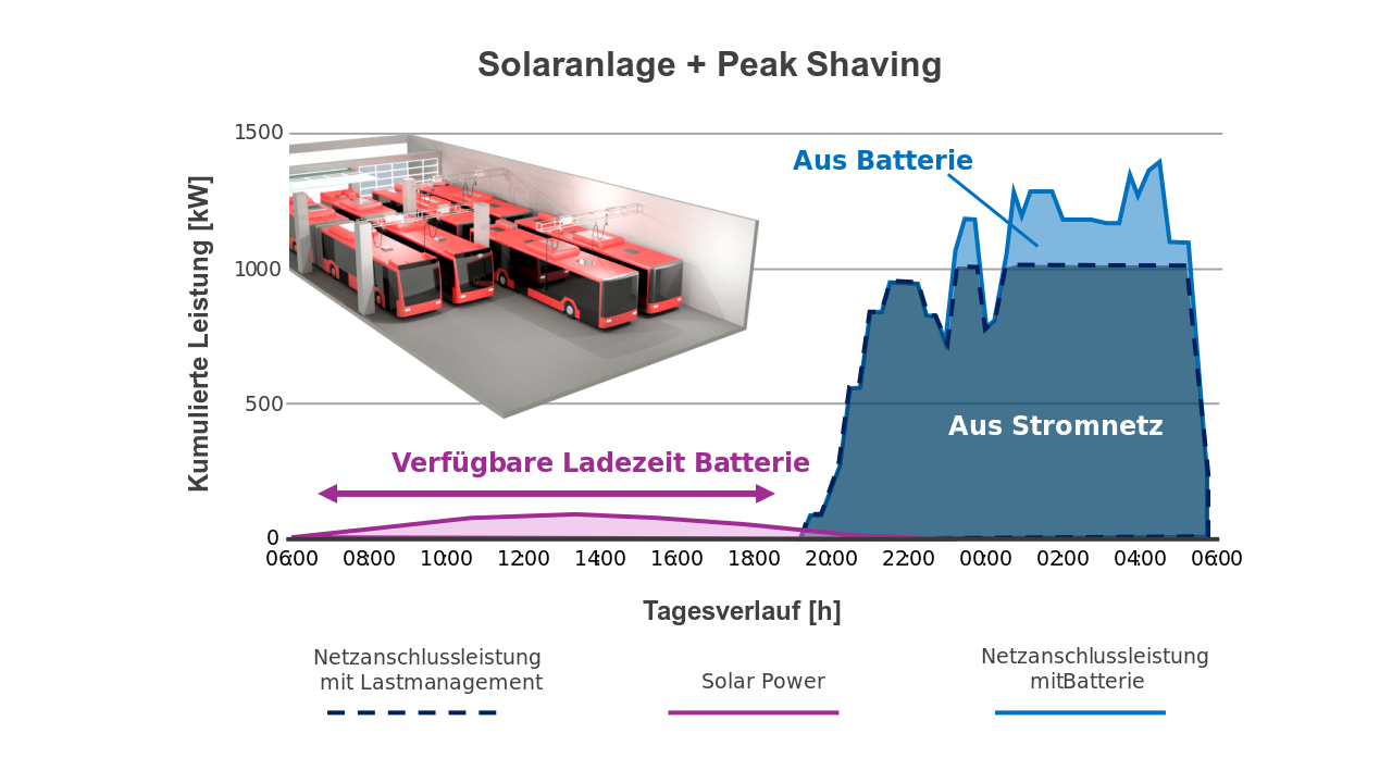 Besonderes Augenmerk lag dabei auf der Integration von Peak Shaving-Strategien zur Vermeidung von Lastspitzen und Optimierung der Energiekosten. Das erarbeitete Ladeinfrastrukturkonzept ermöglicht eine flexible Skalierung parallel zur Umstellung auf Elektrobetrieb, die Integration erneuerbarer Energien und die Optimierung der Betriebskosten durch gezielte Lastverteilung.